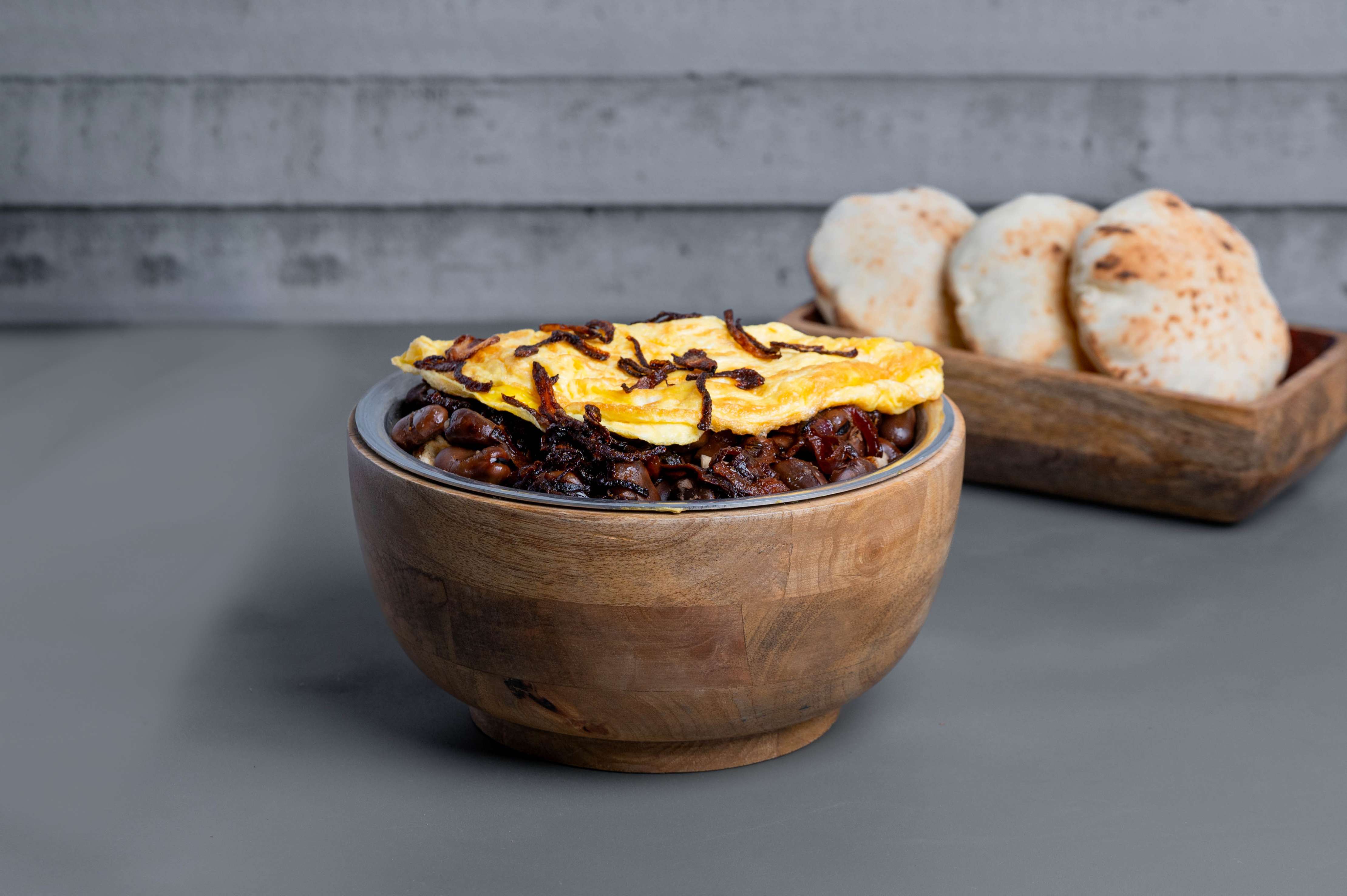 معد بطريقتنا الخاصة بقطع من خبز التميس وحبوب الفول والبصل المكرمل