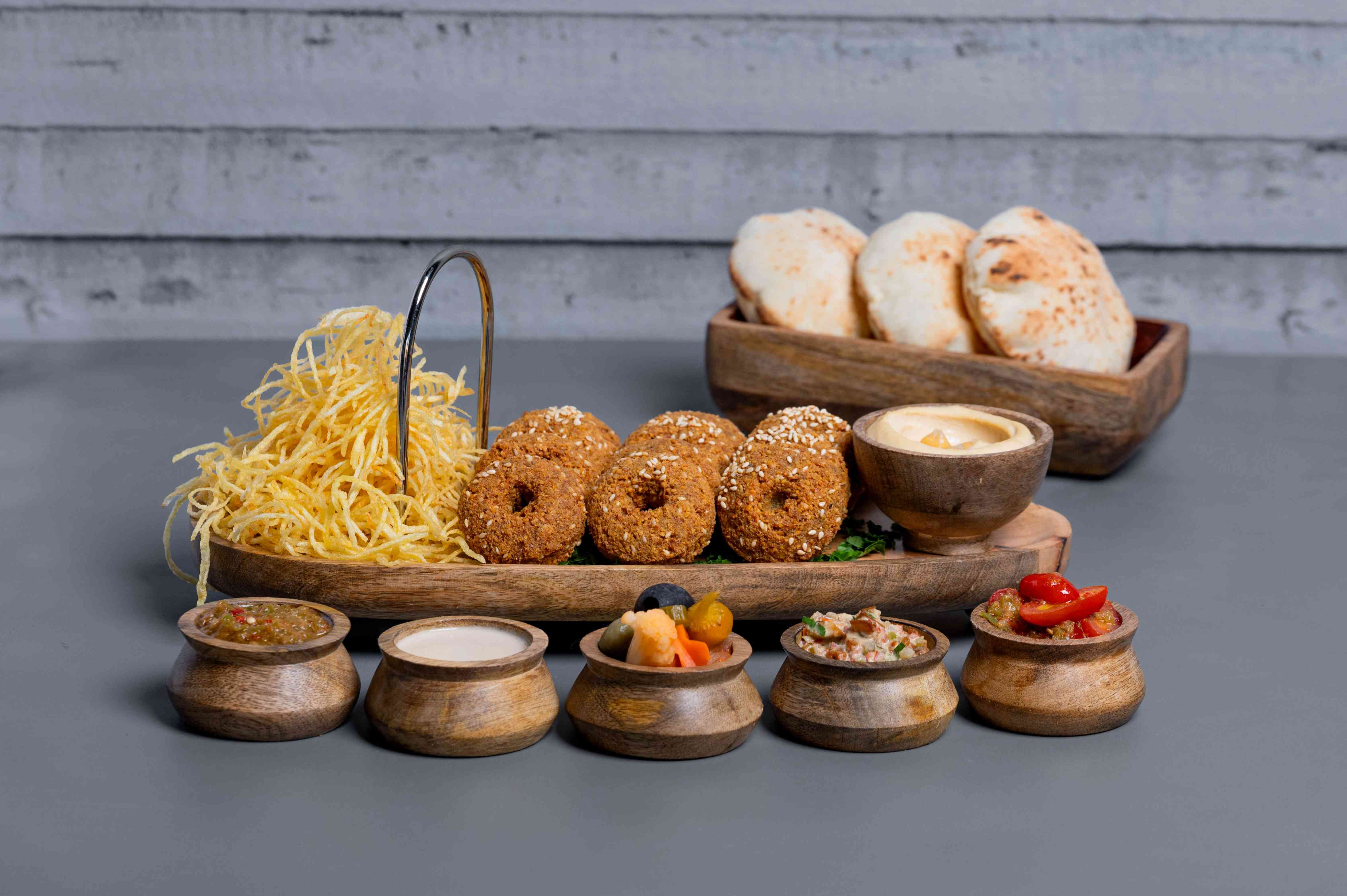 قطع من الفلافل بطريقتنا الخاصة تقدم مع مخللنا الخاص و طحينتنا و المخللات المتنوعة