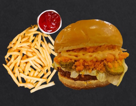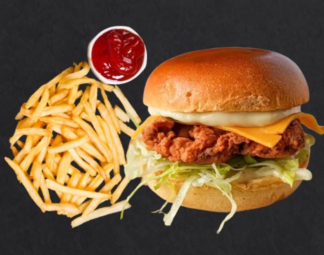 قطعة دجا ج مقرمشة ذهبية ، متبّلة بعناية ومقلية، تُقدَّم في خبز برجر طري مع شرائح الخس والمخلل ، وصوص المايونيز الخاص . يُرافقه طبق البطاطس المقلية المقرمشة