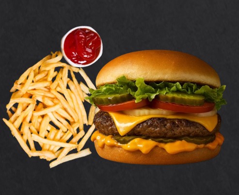 قطعة لحم بقري مشوية بعناية مع صوص جوسي ومتبّلة بنكهات مميزة، تُقدّم داخل خبز البرجر الطري مع شرائح الطماطم، الخس، والبصل، وصلصة الكاتشب والمايونيز. يُرافقه طبق البطاطس المقلية المقرمشة