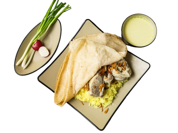 طبق المنسف الأردني التقليدي، المكون من لحم موزات الضأن الطري المطهو ببطء، والأرز الفاخر المغطى باللبن الرائب الغني والمزين بالمكسرات والبقدونس. يقدم مع طبق لبن للإضافة حسب الرغبة