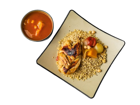 المفتول البلدي المحضّر من القمح المجروش، يُطهى على البخار ويُقدَّم مع قطع دجاج، وخضار موسمية مطبوخة بمرق غني بخليط من البهارات الفلسطينية والمغربية. طبق دافئ ومغذٍ يعكس عمق النكهة وعبق البيوت القديمة
