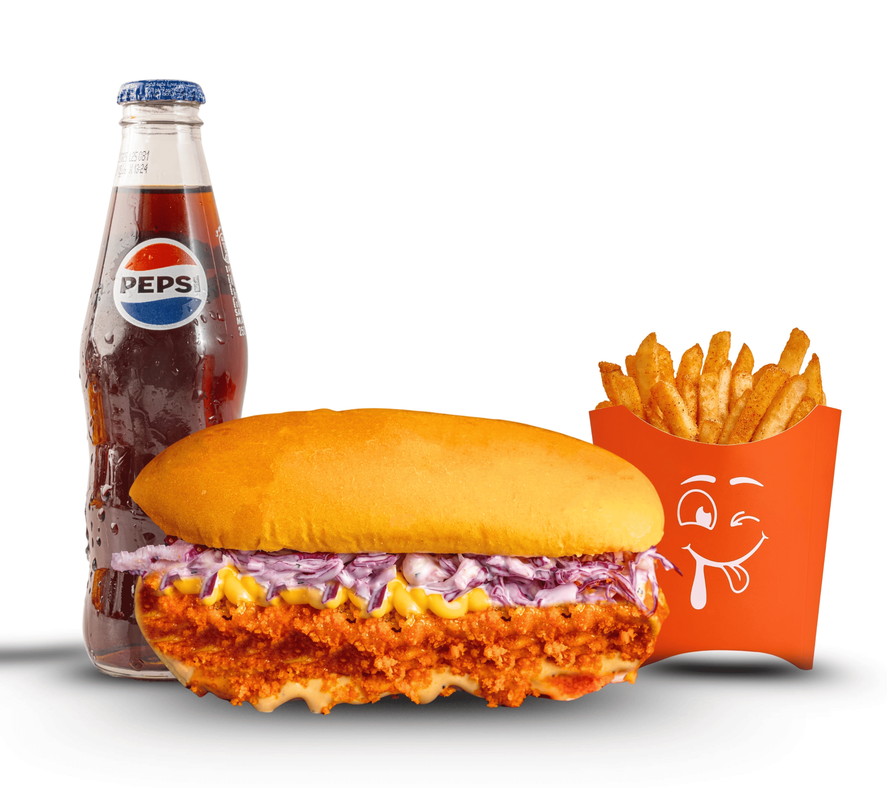 استمتع بوجبة نيو تشكن الشهية التي تتضمن ساندويتش اس اس تشكن الذيذ مع البطاطس المقمرشة ومشروب غازي من اختيارك لتكملة وجبتك المفضلة
