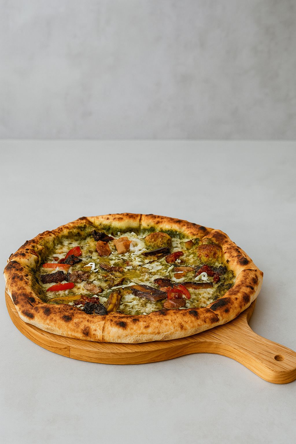 عجينة بيتزا نابولي - صوص الريحان الخاص - جبنة موتزريلا - خظار مشوي - (كوسه - جزر - باذنجان ) - طماطم مجففة