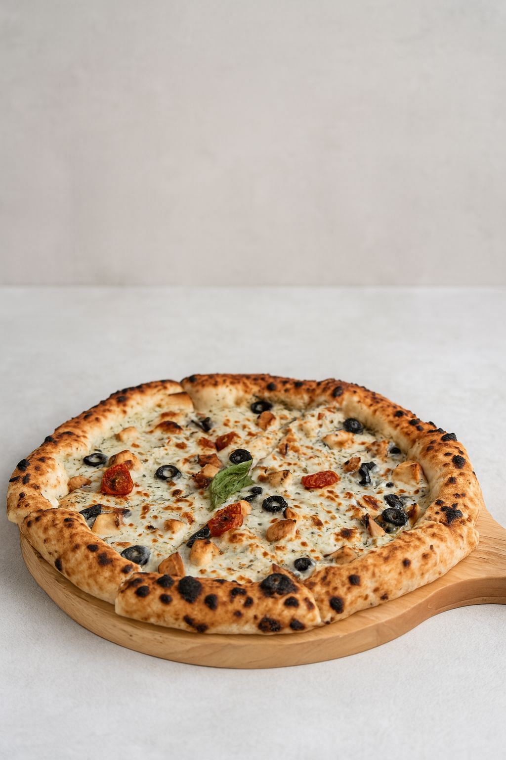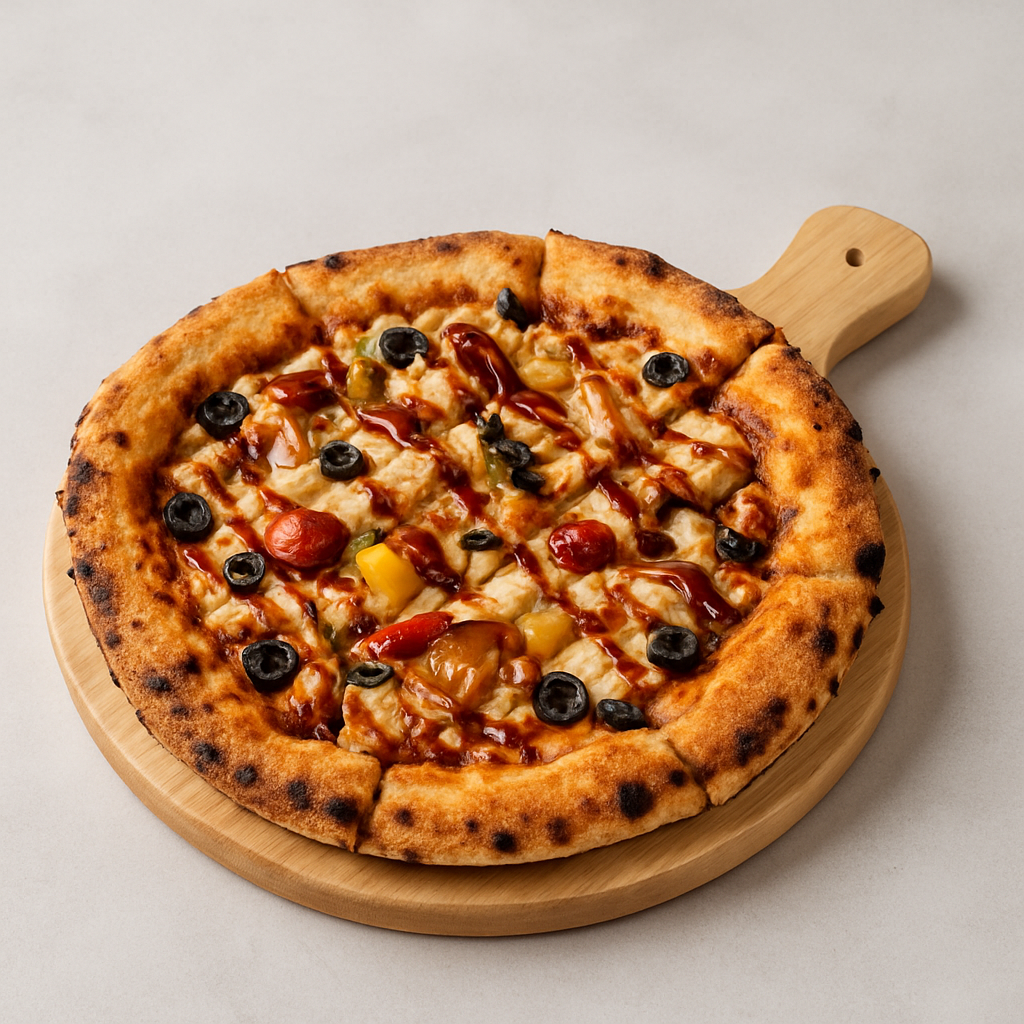 عجينة بيتزا نابولي - صوص بيتزا خاص - جبنة موتزريلا - دجاج باربكيو - طماطم - زيتون - فلفل الوان - صوص باربكيو