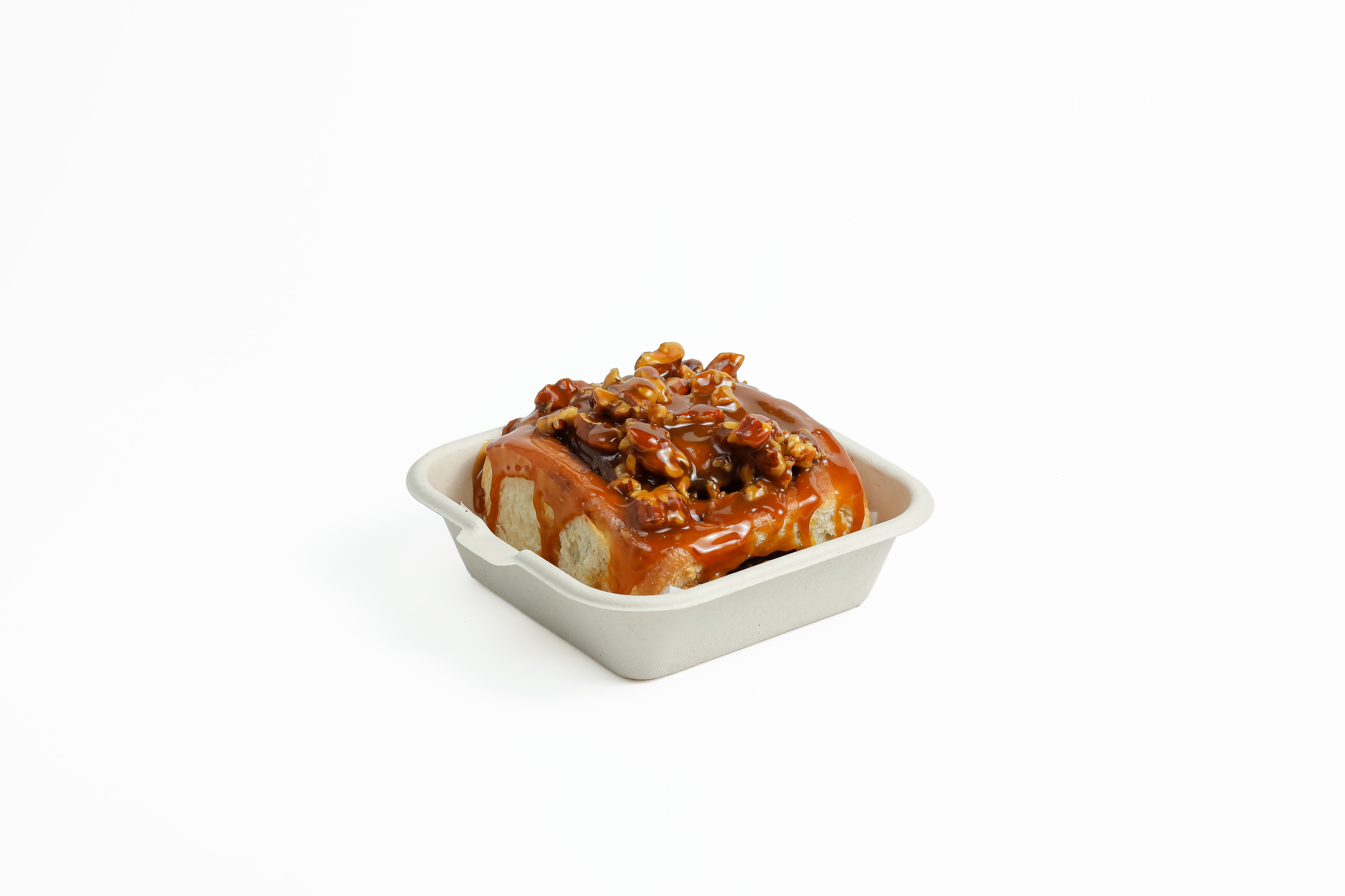 رول القرفة الكلاسيكي مع توبينج من البيكان المحمص والكراميل. يقدم ساخنًا للحصول على أفضل تجربة طعم.