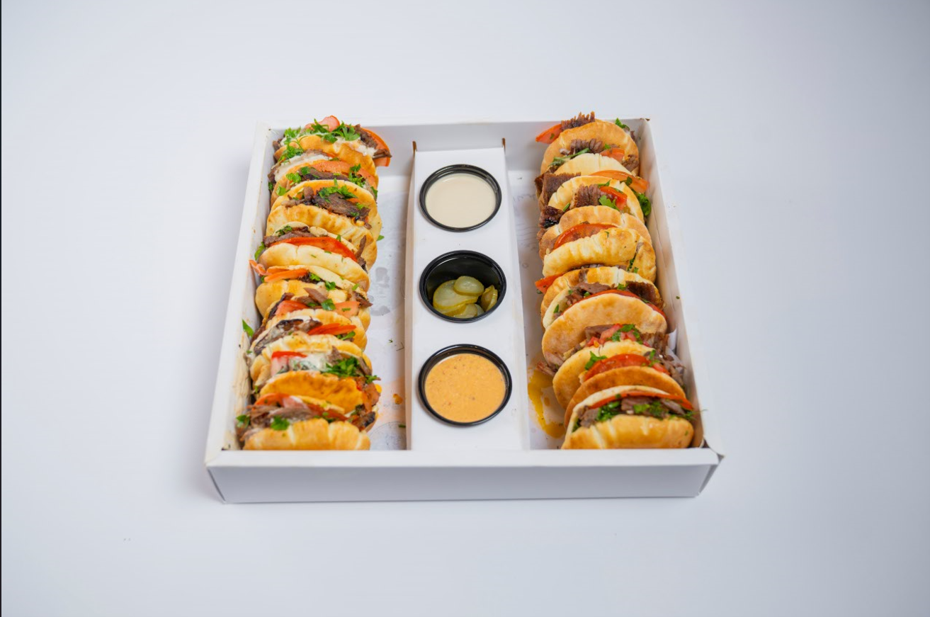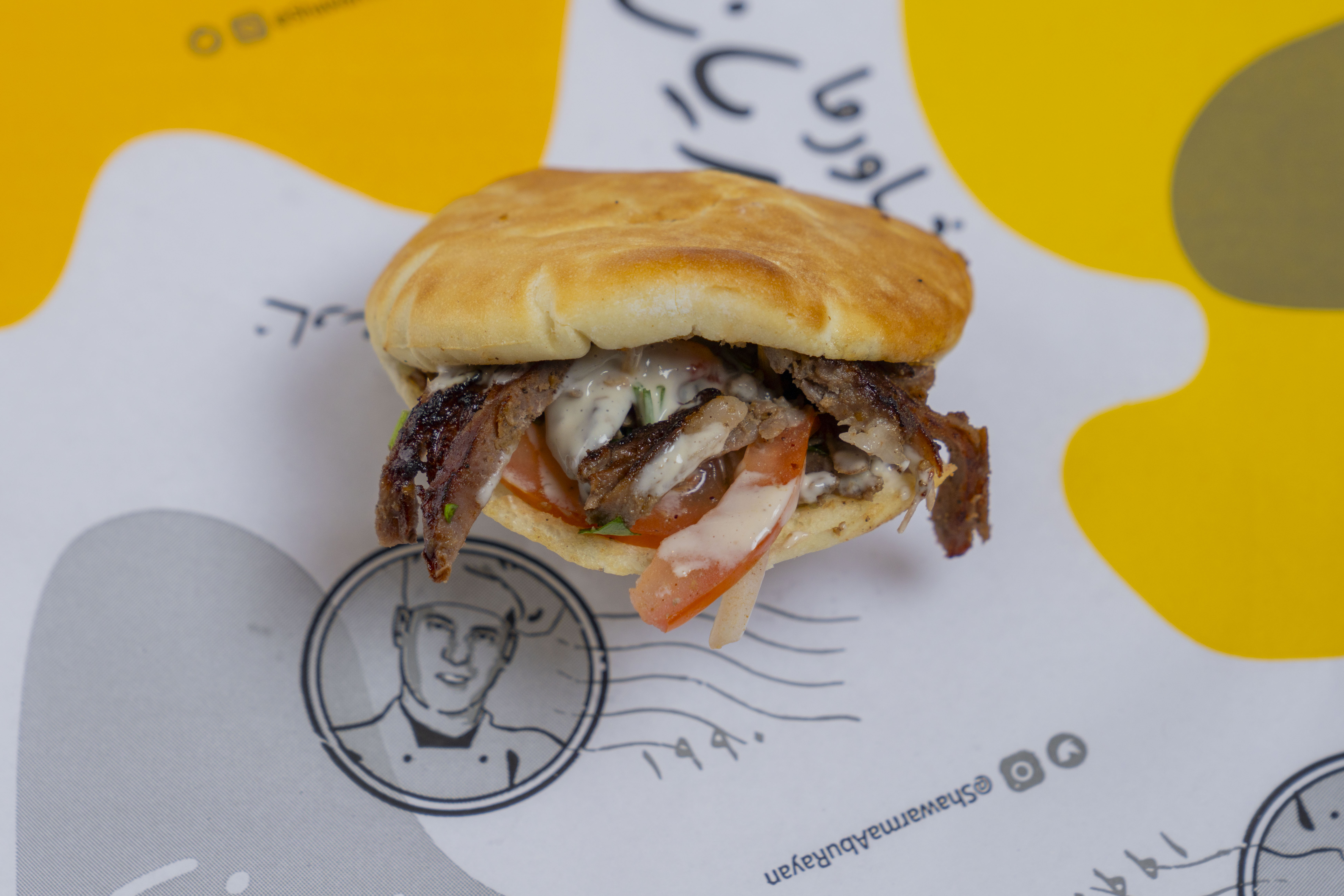 خبز ابو ريان , شاورما لحم , سلطة, طماطم , طحينة