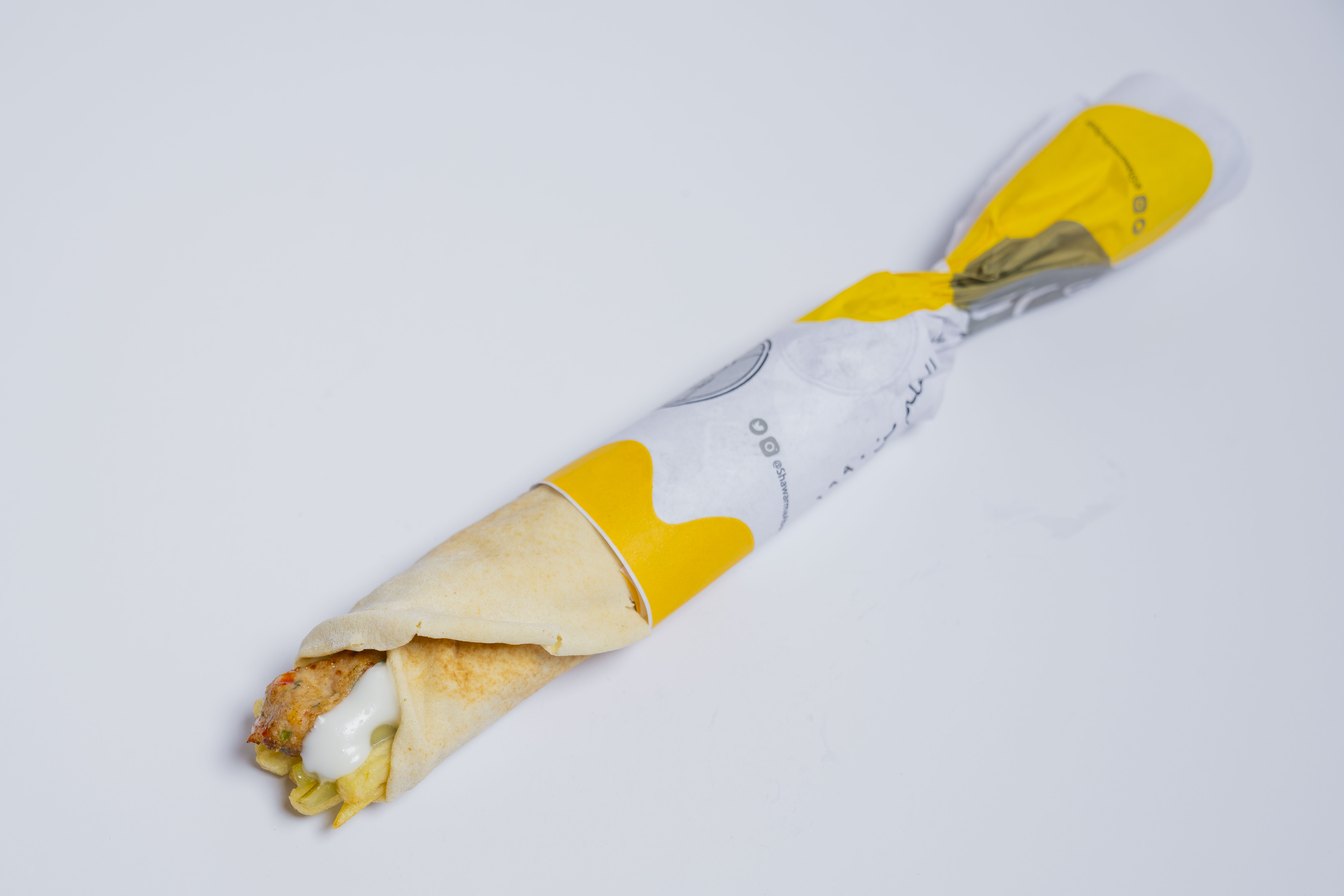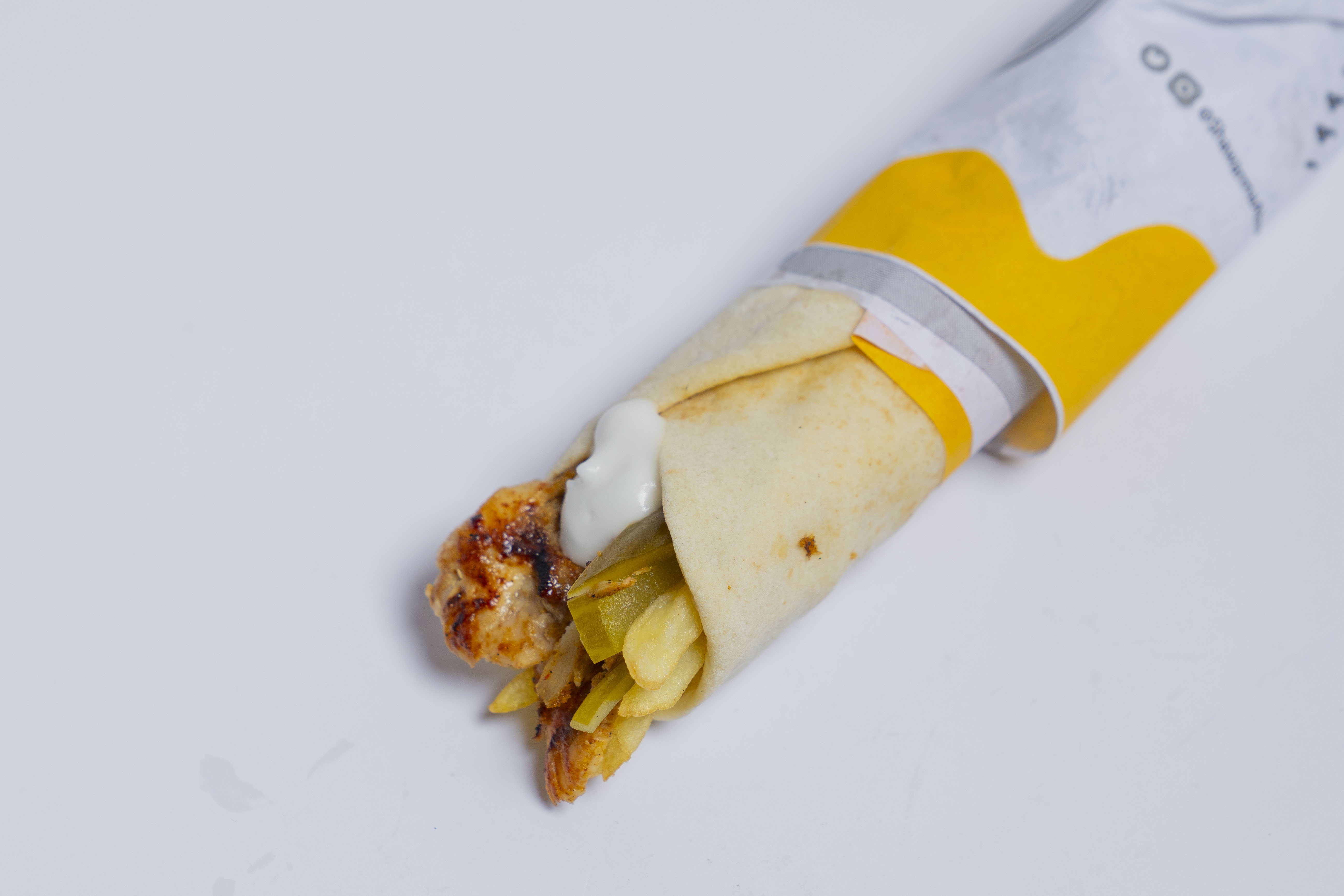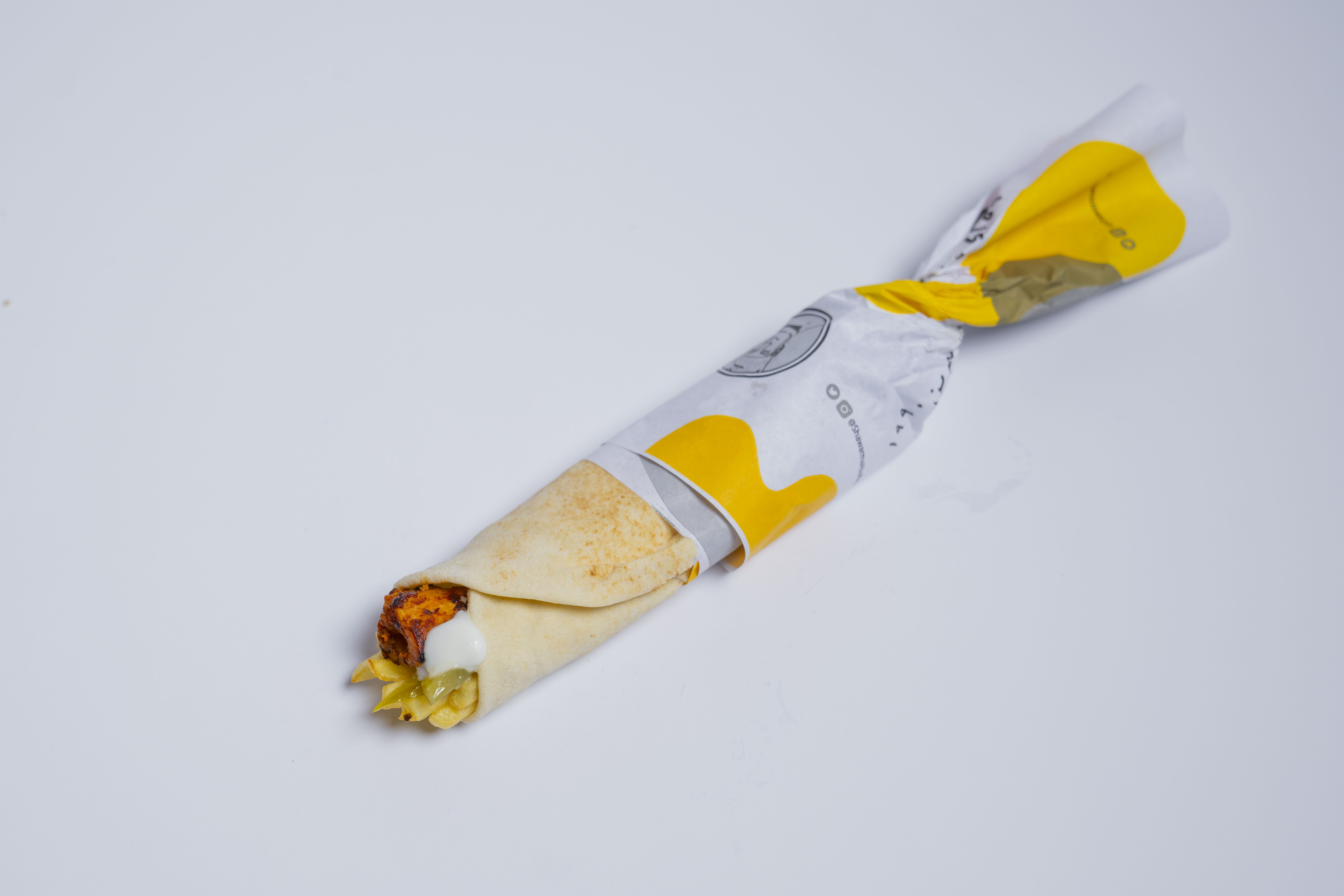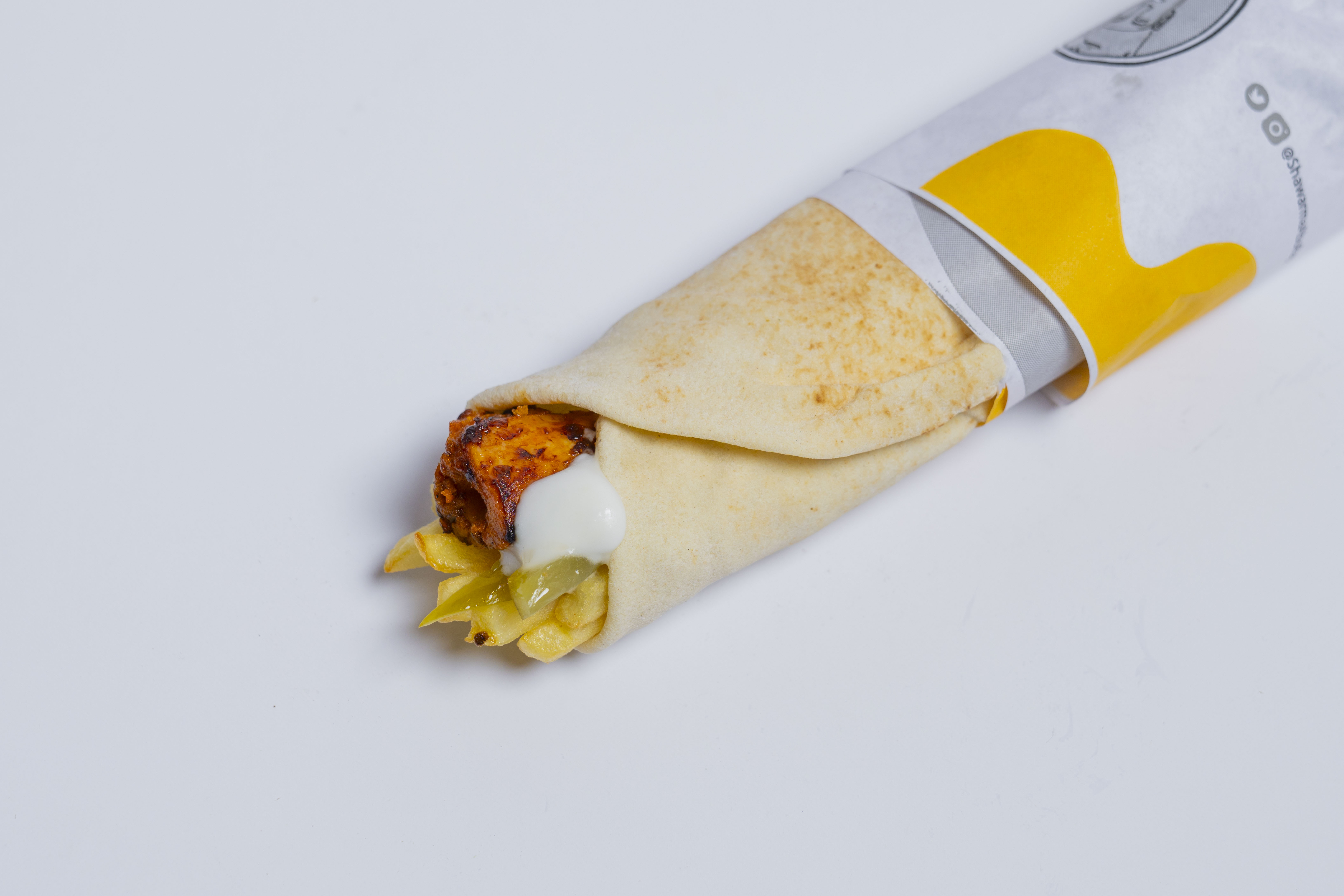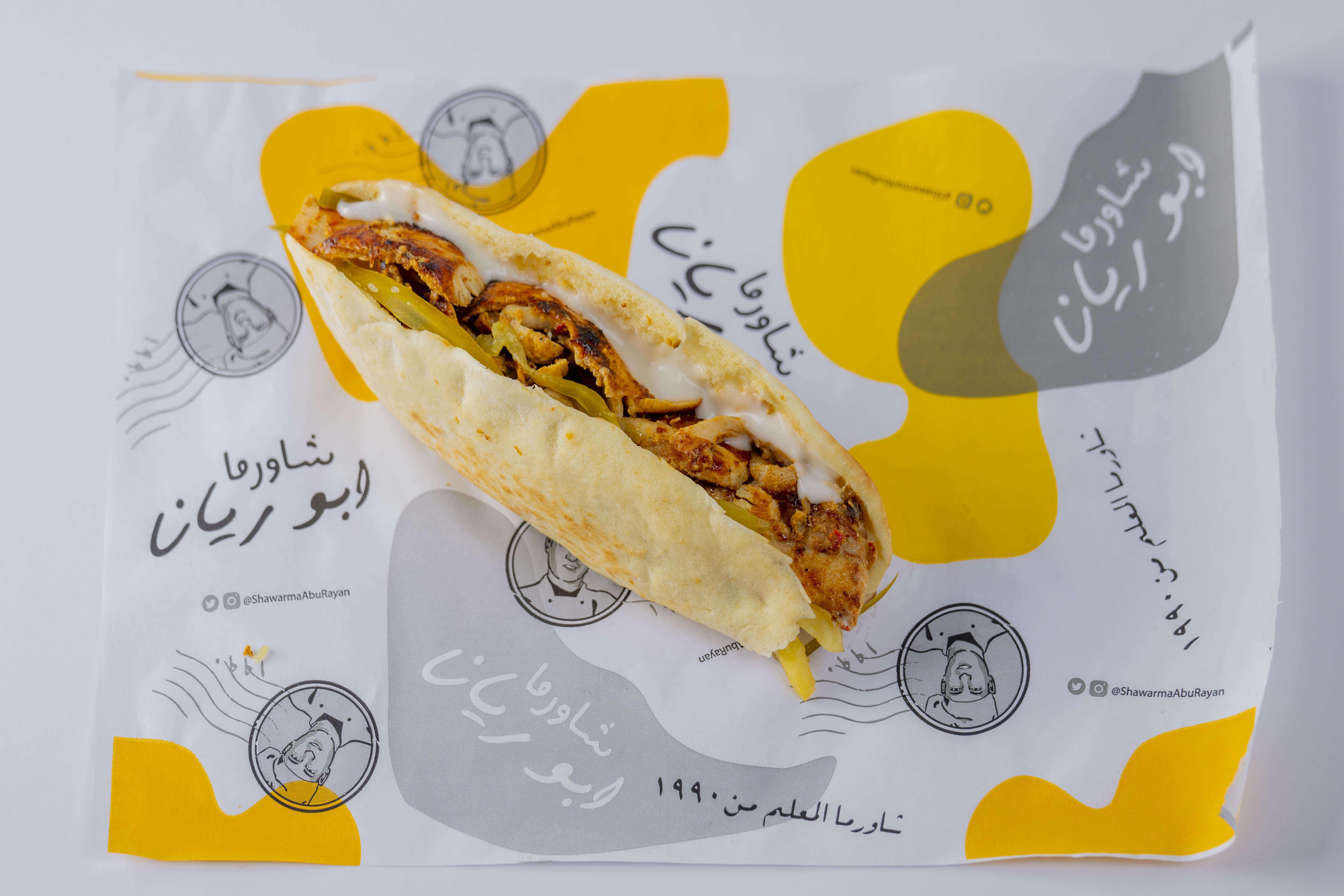 خبز ابوريان , شاورما دجاج , ثوم , مخلل , بطاطا