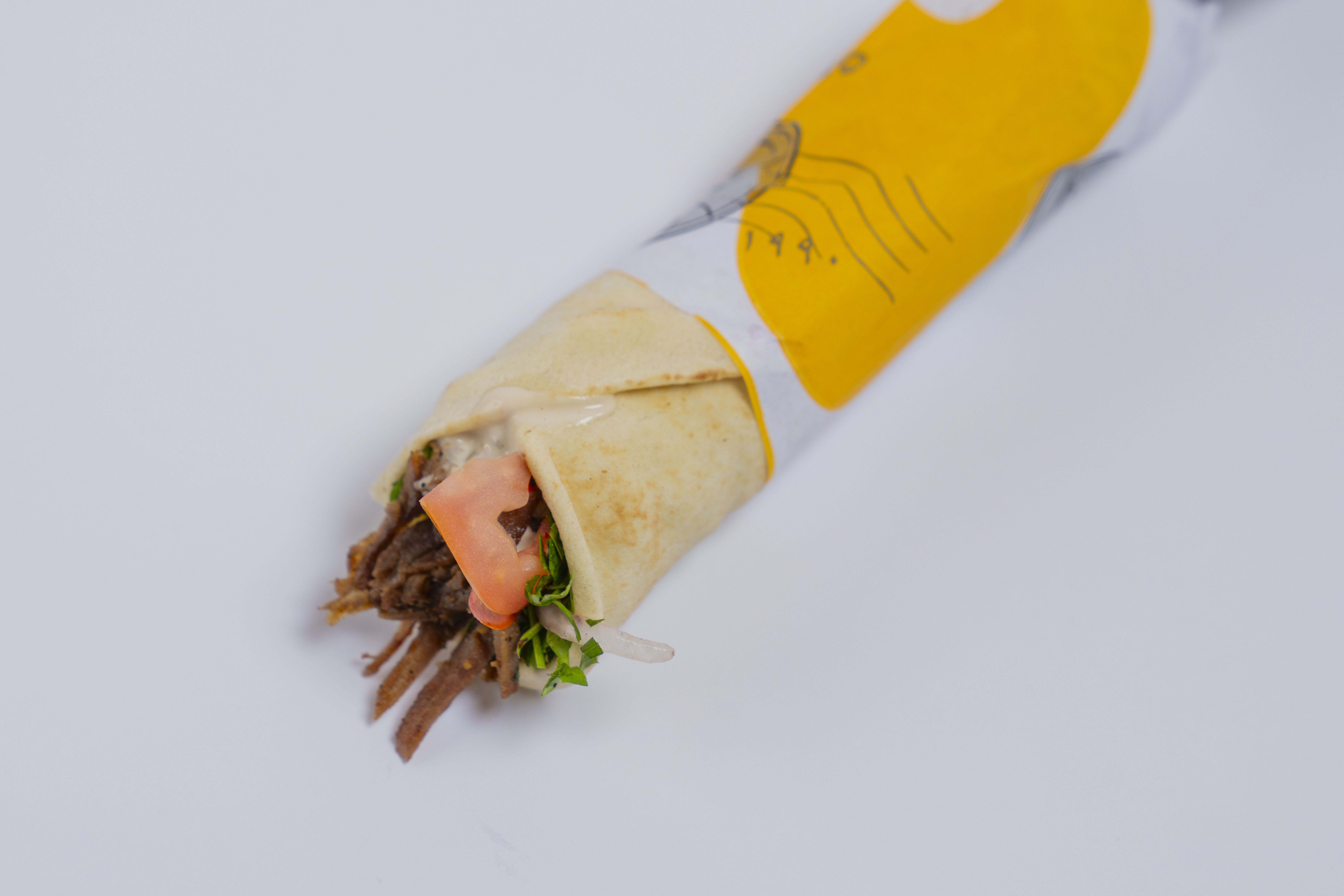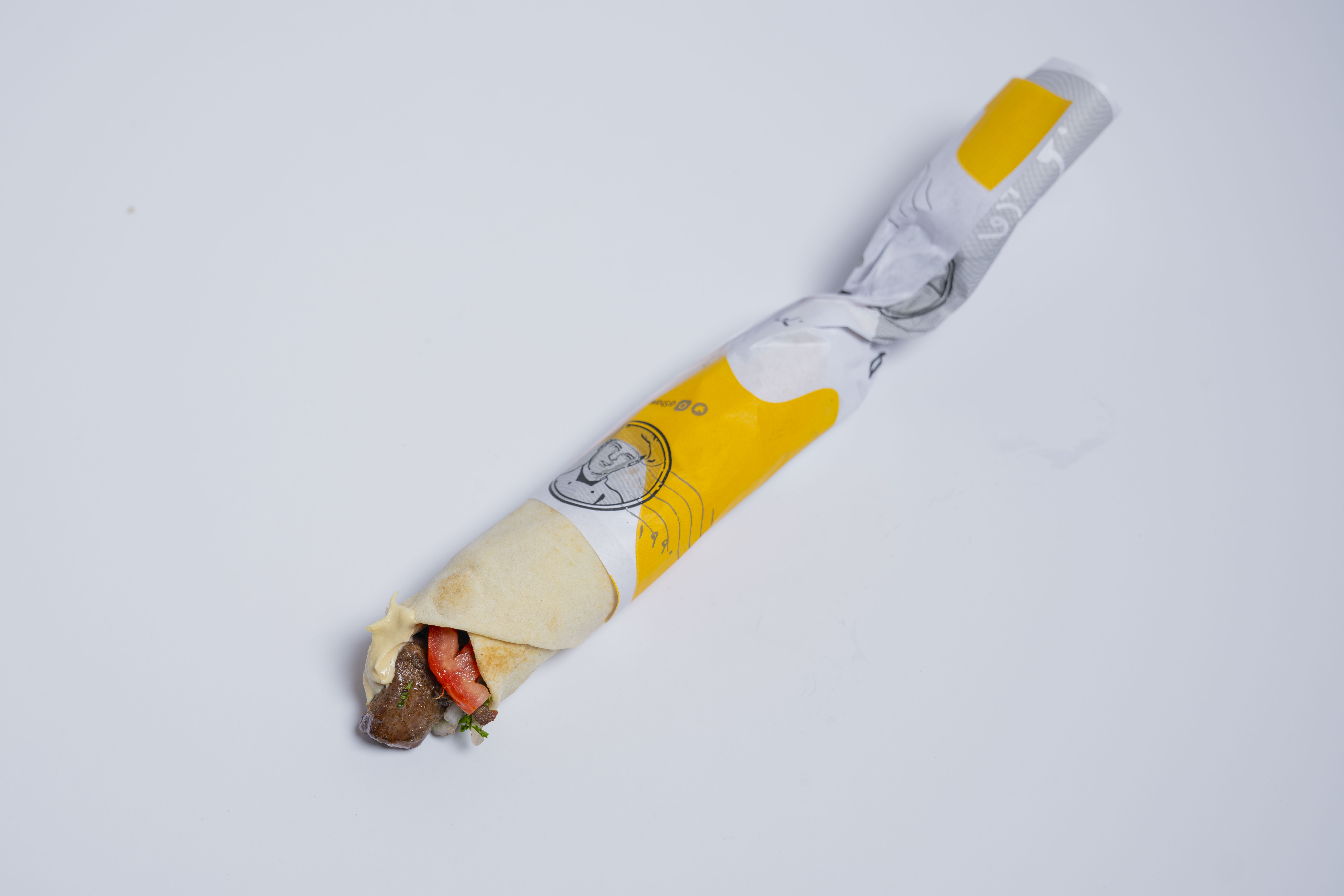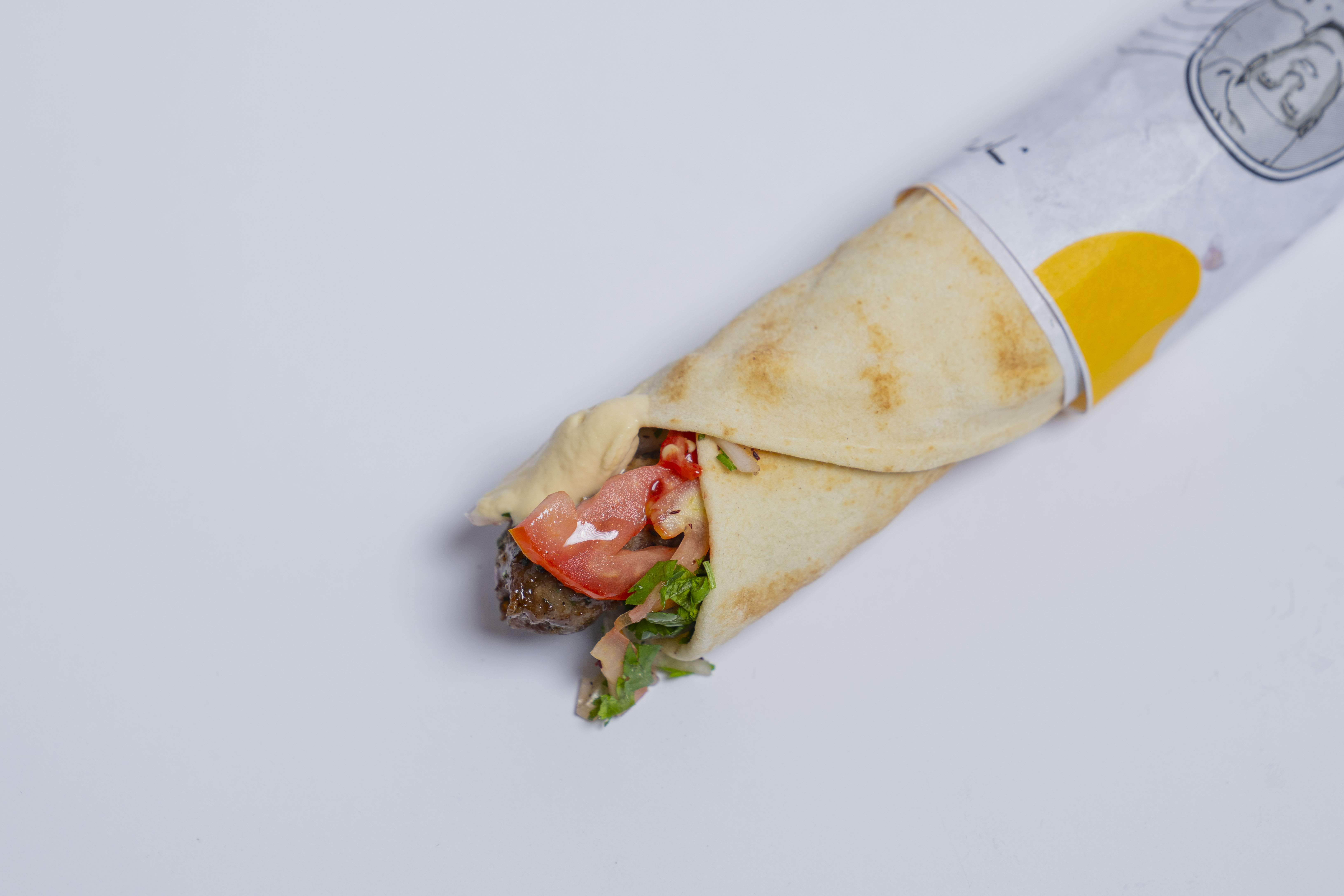 خبز شامي , شاورما لحم , سلطة , طماطم , طحينة